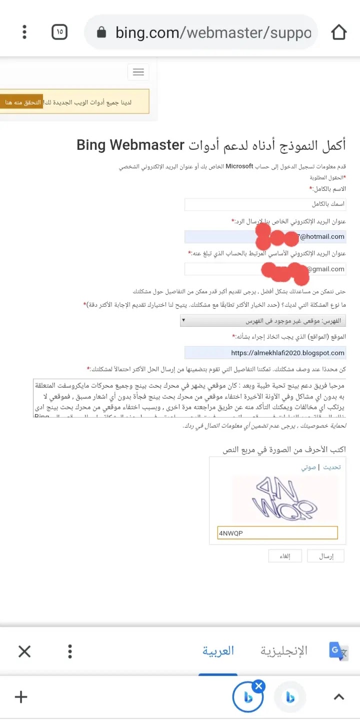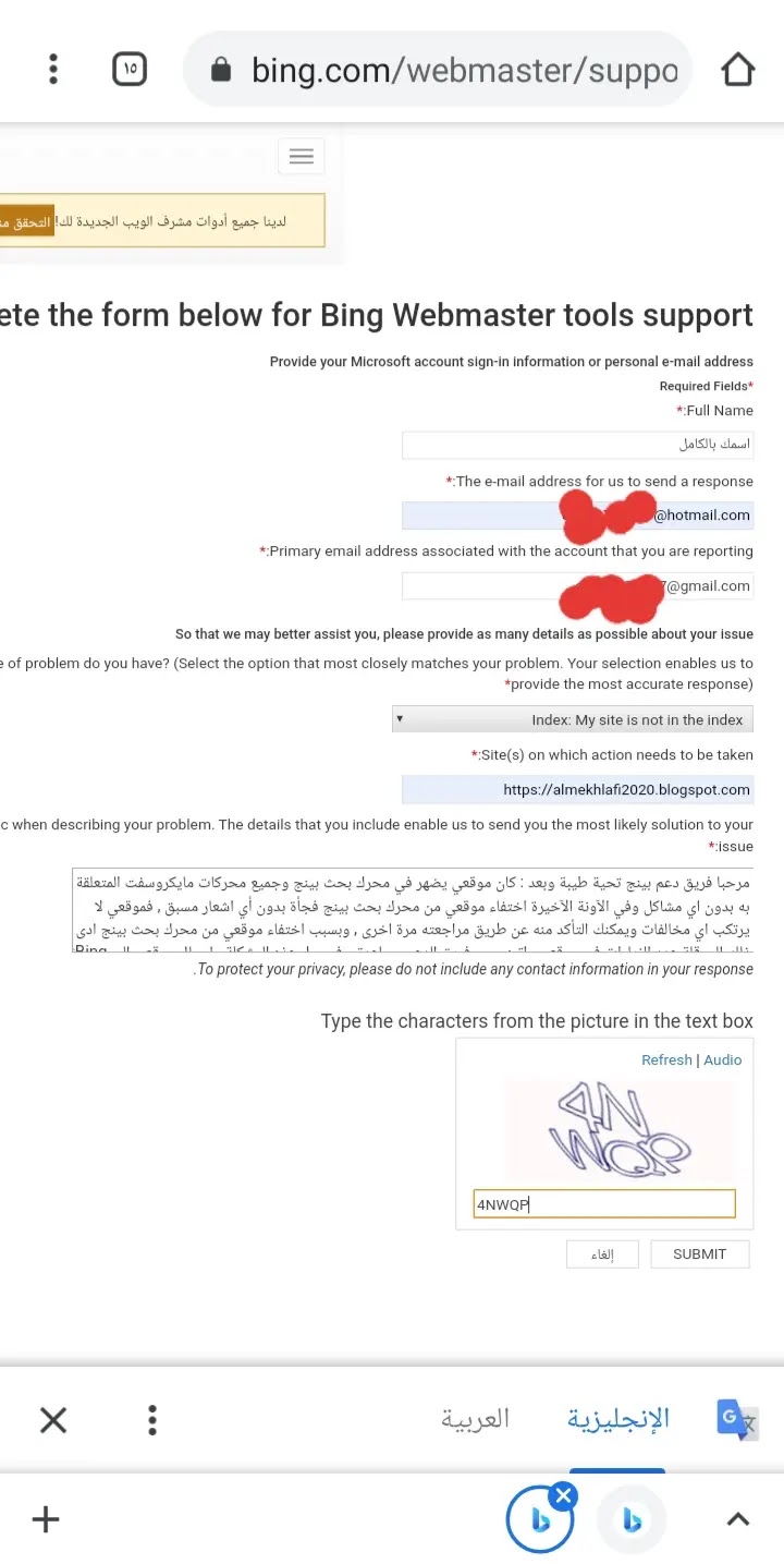 - بعد ذلك قم بشرح توضيحي لفريق الدعم في الخانة الاخيرة Be specific when describing your problem. The details that you include enable us to send you the most likely solution to your issue متضمن الآتي “” مرحبا فريق دعم بينج تحية طيبة وبعد : كان موقعي يظهر في محرك بحث بينج وجميع محركات مايكروسفت المتعلقة به بدون اي مشاكل وفي الآونة الآخيرة اختفئ موقعي من محرك بحث بينج فجأة بدون أي اشعار مسبق , فموقعي لا يرتكب اي مخالفات ويمكنك التأكد منه عن طريق مراجعته مرة اخرى , وبسبب اختفاء موقعي من محرك بحث بينج ادى ذلك إلى قلة عدد الزيارات في موقعي , اتمنى من فريق الدعم مساعدتي في حل هذه المشكلة وإرسال موقعي إلى Bing باستخدام أداة URLsubmit ، سيؤدي ذلك إلى تسريع عملية الفهرسة وسيساعد في إجراء زحف جديد على الموقع الخاص بي , شكراً فريق الدعم “”.
