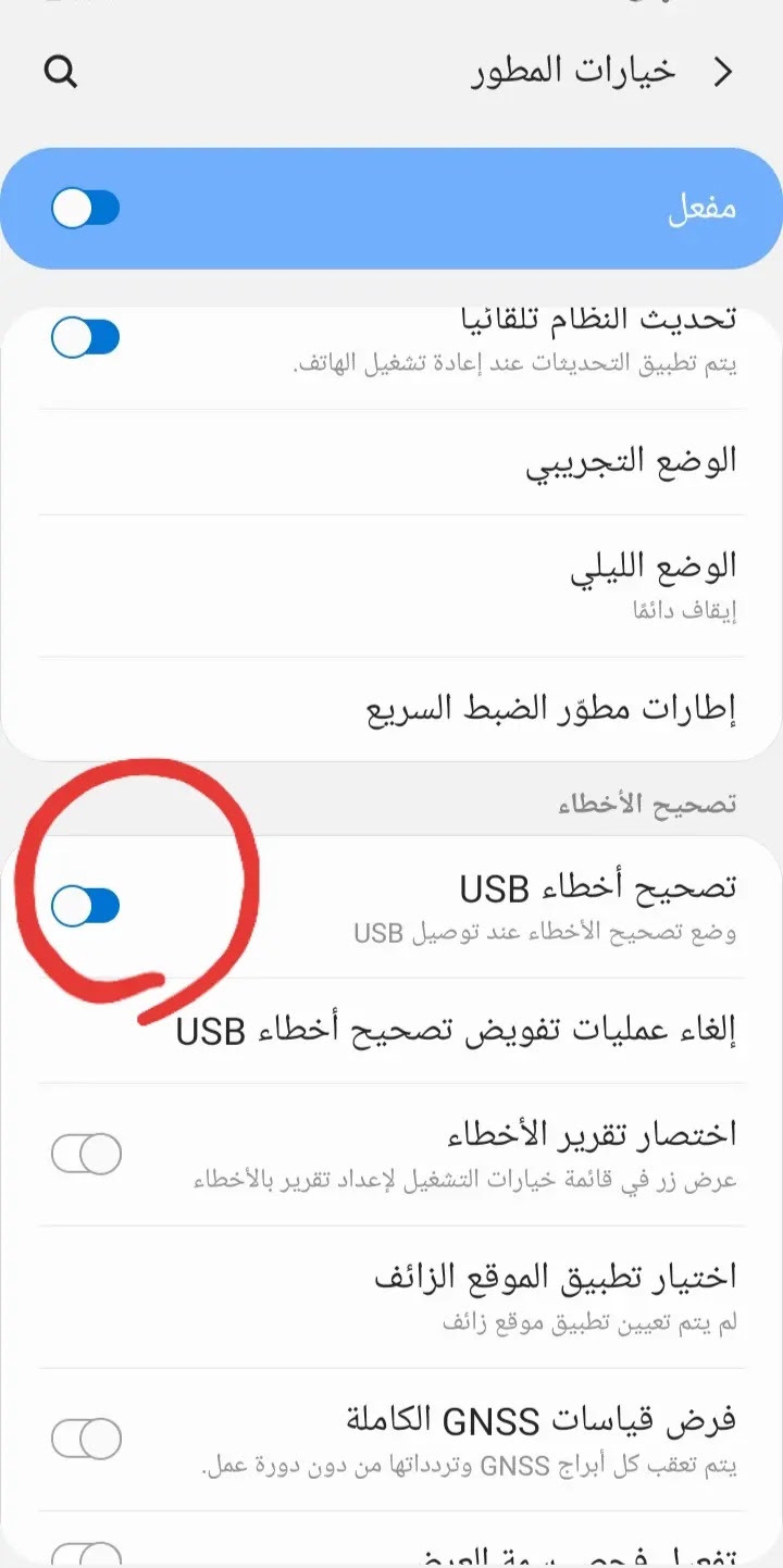 - تفعيل منفذ USB من الهاتف من خيارات المطور ، خيار المطور يتم تفعيله بالدخول إلى الاعدادات حول الهاتف ، معلومات البرنامج والضغط على رقم الاصدار اكثر من 5 مرات متواصلة حتى يتم التفعيل بعد ذلك قم بالخروج الى شاشة الاعدادات الرئيسية ستلاحظ ضهور خيار جديد وهو خيارات المطور قم بالدخول اليه وتفعيل USB (تصحيح أخطاء USB ) .
