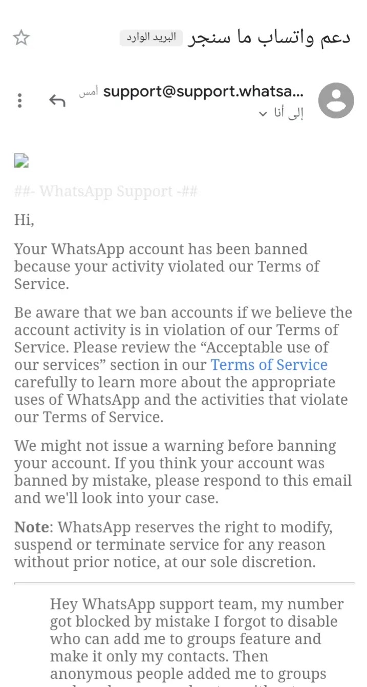 مرحبا، لدينا سبب للاعتقاد بأن نشاطك قد انتهكت بنود الخدمة الخاصة وقررت للحفاظ على حسابك المحظور. تلقينا عددا كبيرا من الشكاوى حول حسابك ومن أجل حماية خصوصية المستخدمين، ونحن لن نكشف طبيعة الشكاوى. راجع هذا الموضوع البريد الإلكتروني لن يتم قراءة. – دعم دعم ال واتساب نلقي نظرة على مركز المساعدة لدينا!